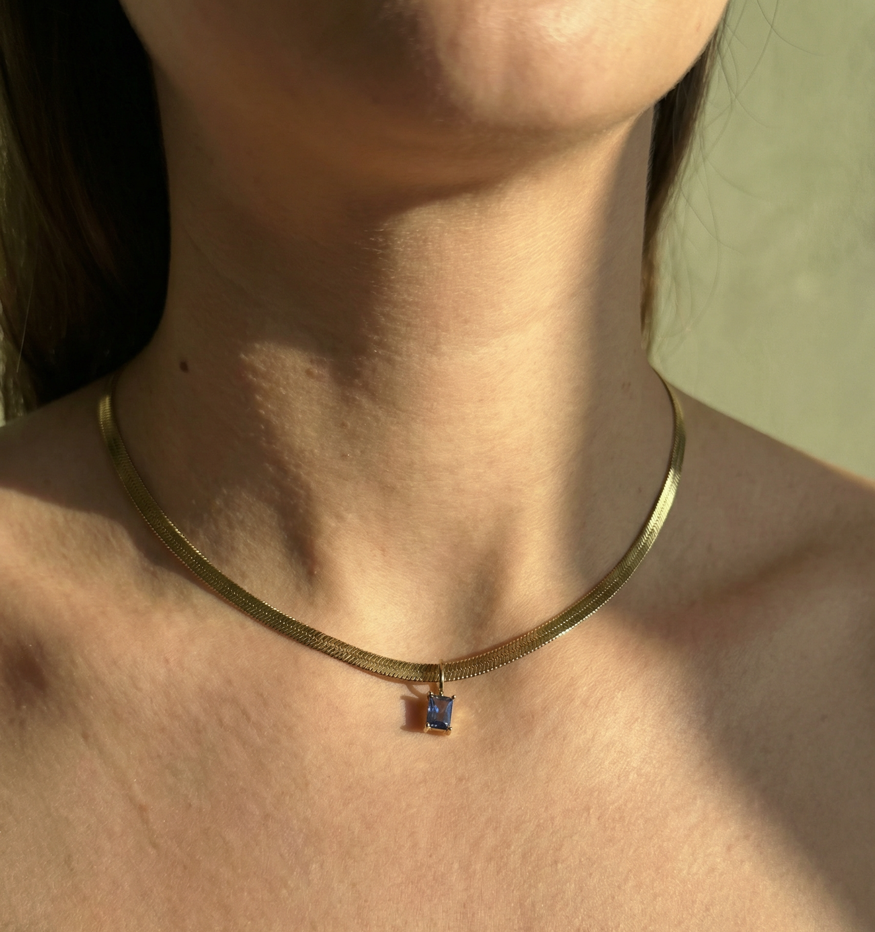 The Riviera necklace pairs a smooth gold snake chain with a blue stone for a look that feels sleek and effortless. Minimal in form but distinctive in detail, it’s designed to sit cleanly against the skin and work seamlessly with both everyday and evening styling.